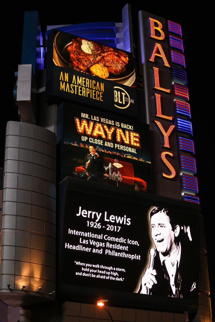 These days, Donny and Marie Osmond occupy the Flamingo showroom, but at 7:49 p.m. Monday — 19:49 in military time, the same year Martin and Lewis hit Las Vegas — Lewis’ image flashed across multiple Strip marquees.