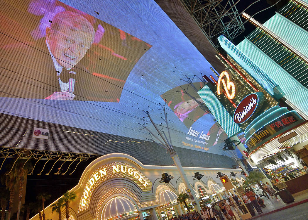 When Fanberg learned about the Lewis marquee tribute on the Fremont Street Experience’s Facebook page, a half-hour before it began, he decided “I’ve got to run down and see this,” he noted. “It’s kind of a cool moment.”