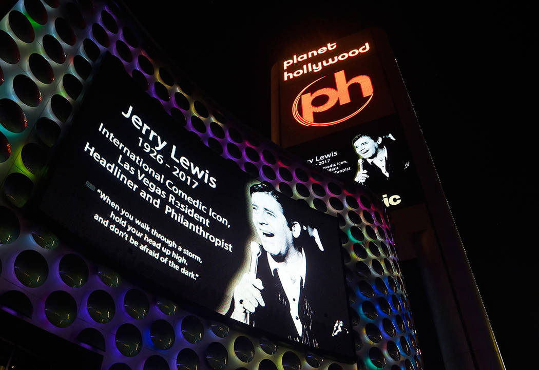 These days, Donny and Marie Osmond occupy the Flamingo showroom, but at 7:49 p.m. Monday — 19:49 in military time, the same year Martin and Lewis hit Las Vegas — Lewis’ image flashed across multiple Strip marquees.