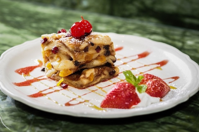 Panettone is the foundation of this raisin-and-bread pudding; because the bread is so eggy, it bakes into a silky custard that contrasts with the buttery golden brown crispness on top, $8.