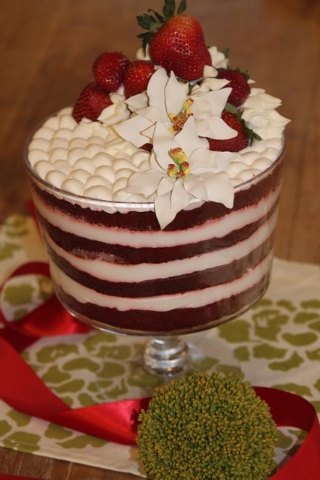 Red velvet cake is layered with vanilla bean cream cheese mousse and topped with sweet cream and fresh strawberries, $3.75 for individual size; larger sizes (must be ordered in advance), $60 in glass bowl, $30 in disposable bowl.