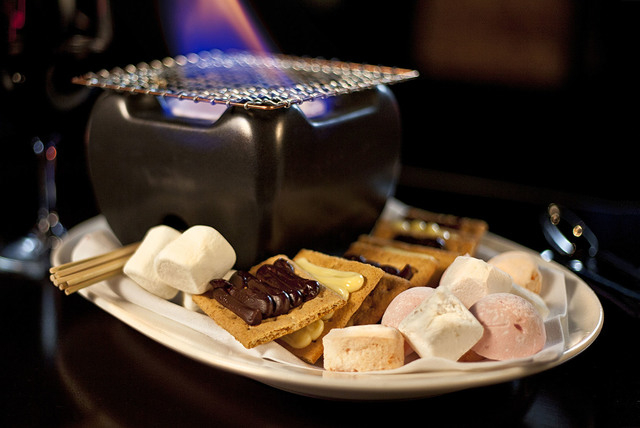 Marshmallows are served with skewers for roasting over the tabletop hibachi grill, and white, milk and dark chocolate graham crackers for melting, $12.