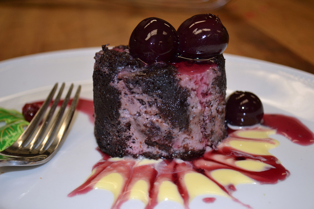 Dark chocolate blackout cake with cherry- and kirsch-flavored custard is served with Bing cherry sauce and kirsch anglaise sauce, available Christmas night as part of a four-course dinner, $49.95, or $6.95 individually.