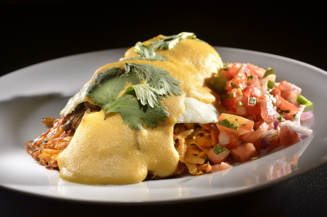 Shredded sweet-potato cakes are the base for two over-easy eggs or tofu scramble with julienned poblano and jalapeno peppers and roasted mushrooms, topped with a sweet corn sauce, pico de gallo and toasted pepitas, $11 during brunch, 8 a.m. to 2 p.m. daily.