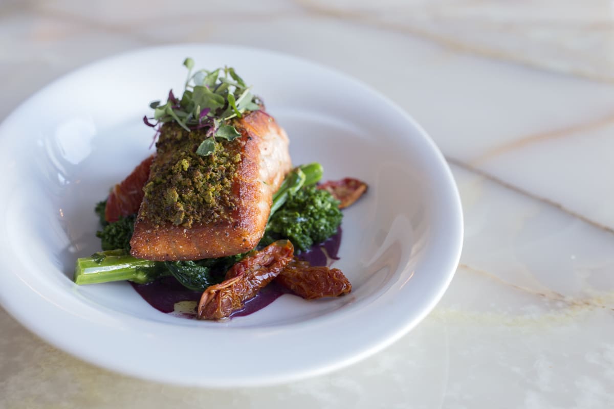 Chef Julian Serrano encrusts salmon with pistachio at his Italian restaurant with stunning views of the Bellagio Fountains. The fish is then served with rapini and grilled tomatoes in a red wine sauce. $35 at lunch, above; $23 at dinner.