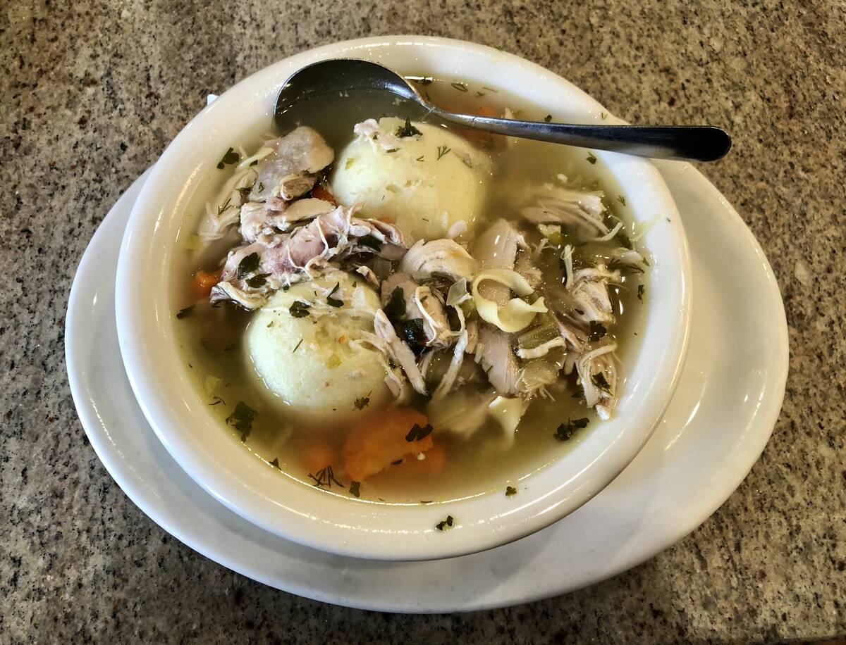 The Bagel Cafe, 301 N. Buffalo Drive, thebagelcafelv.com. The soup here sports two dumplings rising from a broth stocked with thick shreds of chicken, egg noodles, sliced carrots and celery, and occasional gusts of dill (always appreciated). A bagel with choice of schmear comes with a bowl of the soup, making for a filling meal.