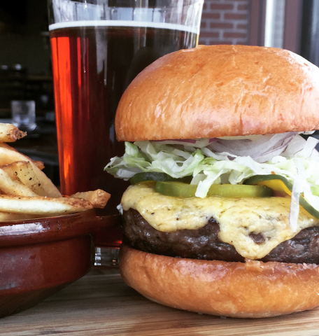 A blend of beef and pork is stuffed with Fontina cheese and topped with soy-marinated onions, jalapeno jelly and fried parsnips, $10.50 — but anybody with “ham” or “burger” in their name can get a free burger Saturday.
