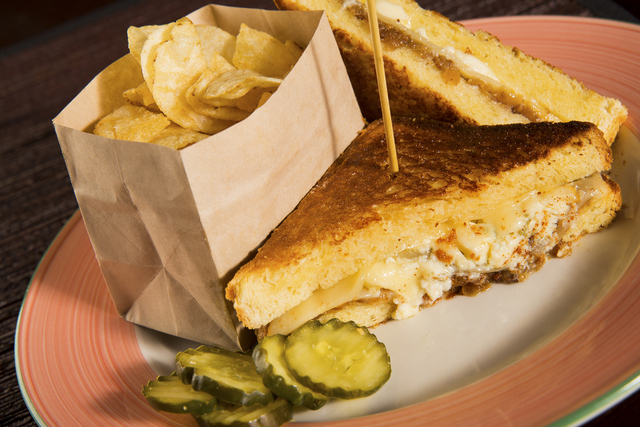 Maytag bleu and Muenster cheeses and onion-bacon jam are sandwiched between slices of brioche and served with kettle chips or a cup of tomato Florentine soup, $14.50.