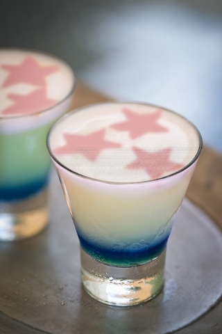 American Harvest Vodka is mixed with blue Curacao, lemon juice, simple syrup and egg whites and topped with a stencil of sprayed Angostura bitters, $.