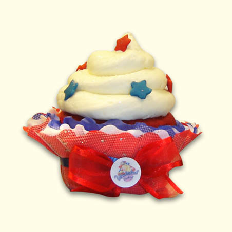 Red velvet cupcakes are topped with cream cheese buttercream and patriotic sprinkles, $3.75.
