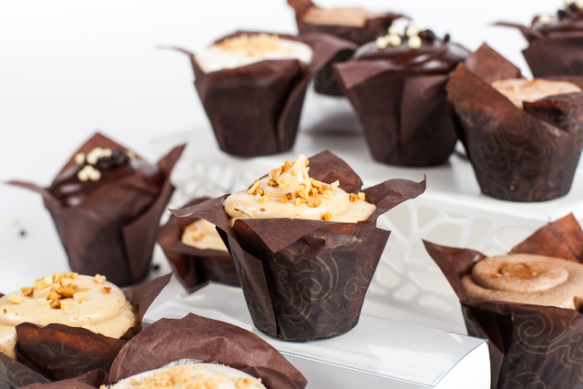 A caramelized banana cupcake is topped with peanut butter cream and toasted chopped peanuts, $2.75.