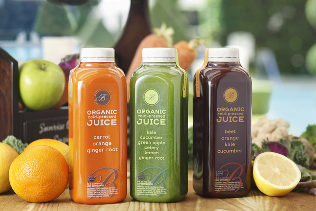 The restaurant’s juices from seasonal produce include the Citrus, with the best citrus of the season, left; Sweet Beet, with beets, pineapple, strawberries, apples and ginger; and Mojave Burn, with oranges, carrots, cucumber, lemons, ginger and cayenne, $5.25 each.