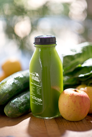Just Greens, left, contains spinach, celery, cucumbers, Swiss chard, parsley, kale and lemon, $11; while Sunny Day has pears, pineapple and strawberries, $11; Beet, Carrot and Greens is self-explanatory, $11.