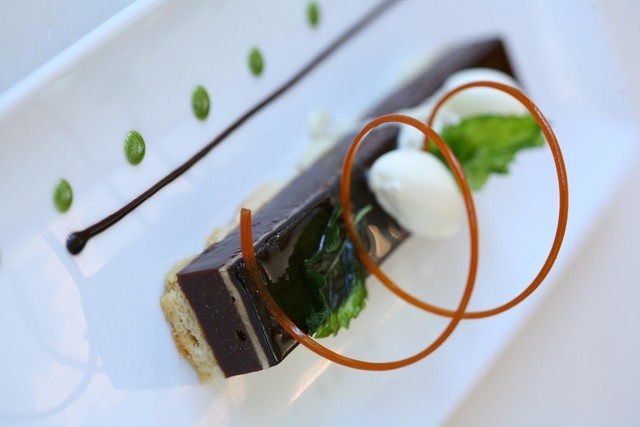 Peppermint-infused dark chocolate ganache and mint cream cheese mousse are enfolded by an Oreo crumb crust and crowned with whipped topping, $3.75, or $26 for a whole pie.