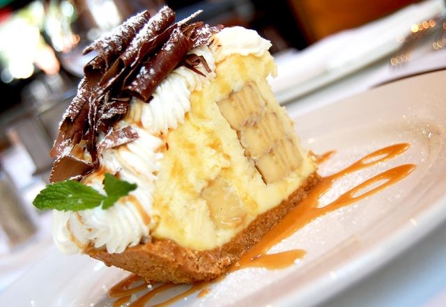 Rich banana filling is mounded in a graham cracker crust and topped with chocolate shavings, caramel sauce and whipped cream, $9 to $12.
