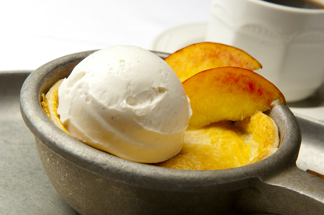 Sweet Southern peaches are piled in a flaky pie crust and served warm, with vanilla ice cream, $7.95.