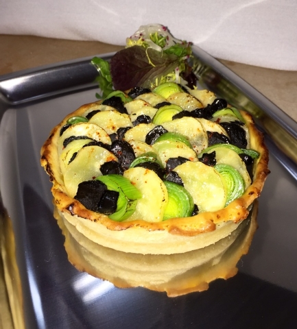 Sliced celery root, black truffles and leeks are shingled in a mosaic and served in individual portions, $14.
