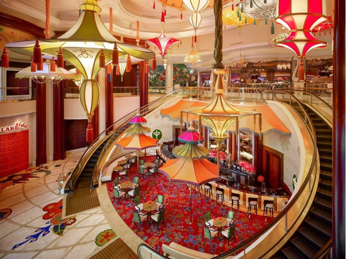 Bar Parasol (the reimagined Parasol Down) lies just across the gangway from Aft Cocktail Deck at Wynn, in a colorful soaring alcove fitted with parasol-inspired fixtures above, parasols sheltering the tables below, and a bar that runs the length of the space crowned by a parasol canopy.