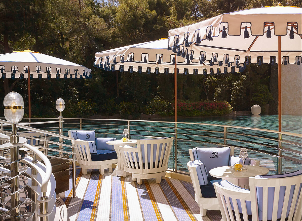 Parties held on superyachts inspired this bar docked on the Lake of Dreams at Wynn Las Vegas. Two terraces — the upper and lower decks — feature ship railings, plump curving banquettes, swivel deck chairs, and crenellated white umbrellas with nautical blue tassels.