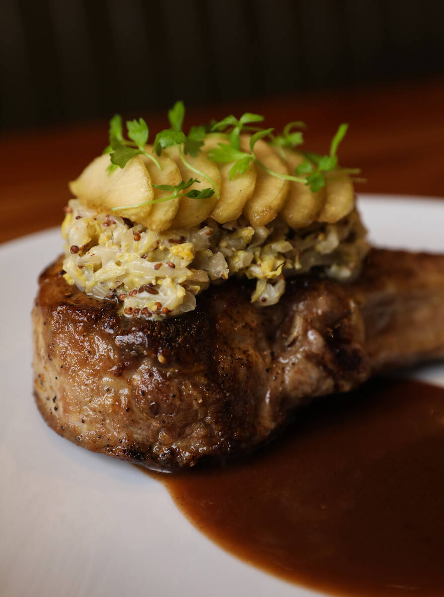 The kitchen refashions the traditional pairing of pork and applesauce with a Kurobuta pork tomahawk topped by sliced Fuji apples and creamed cabbage braced with hot Japanese mustard.