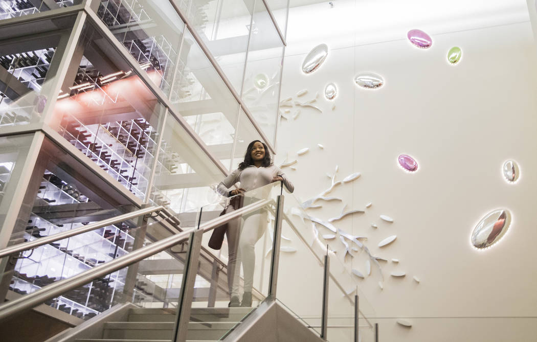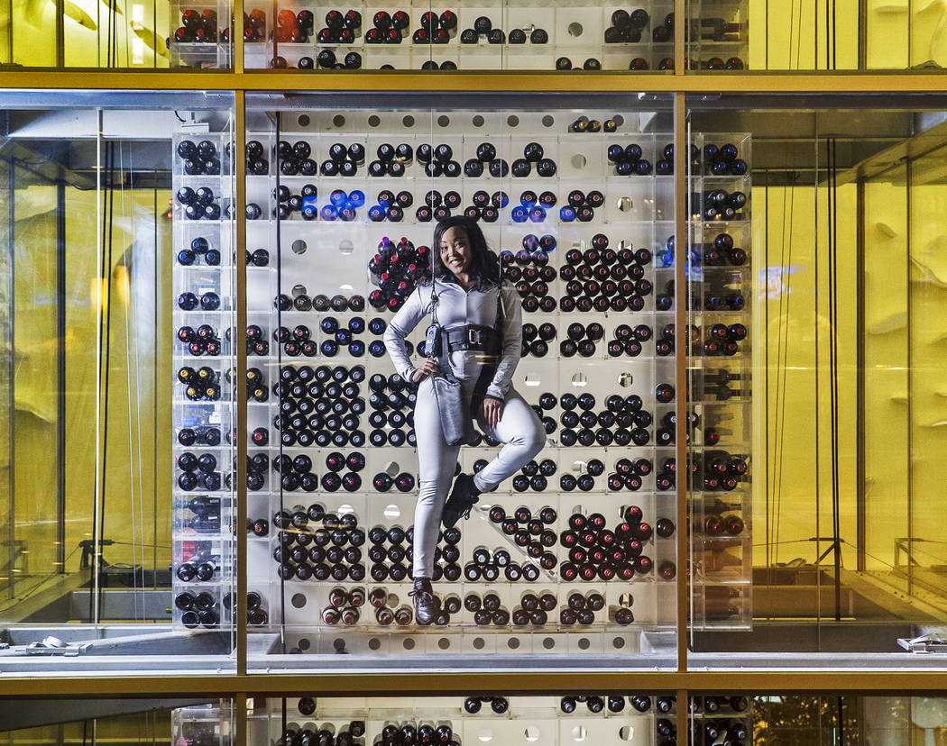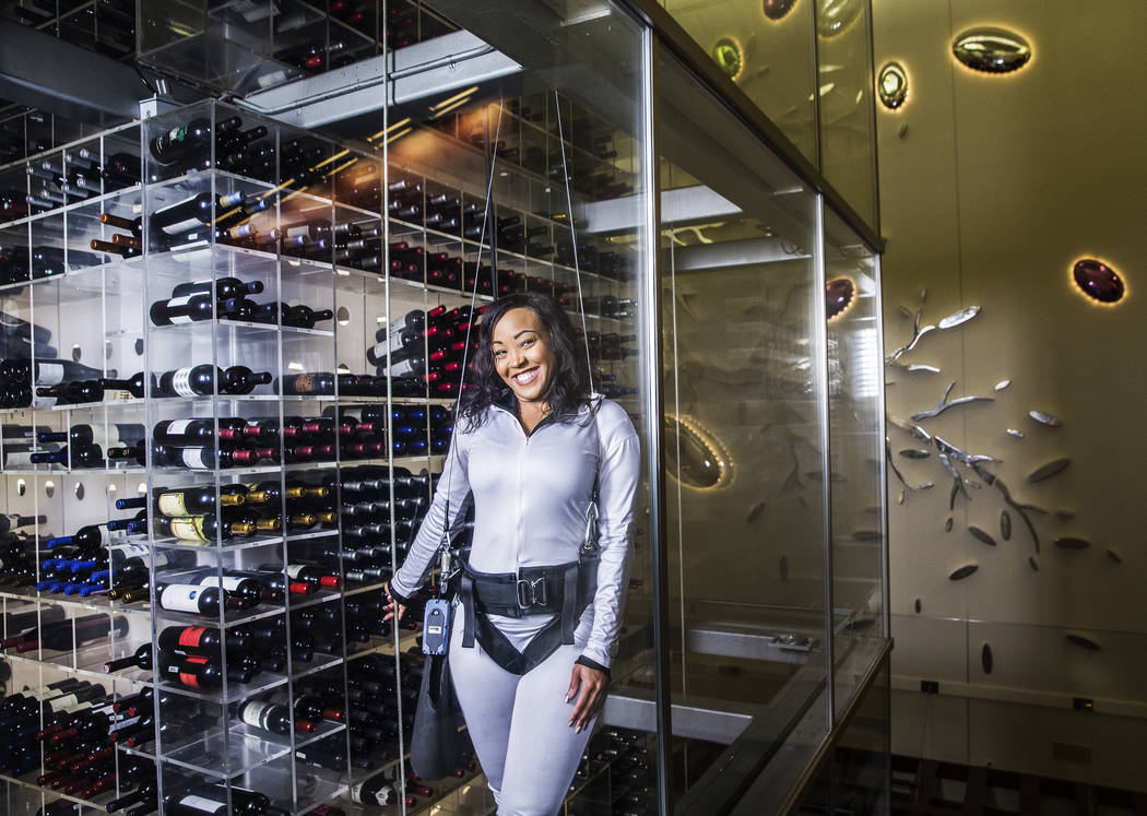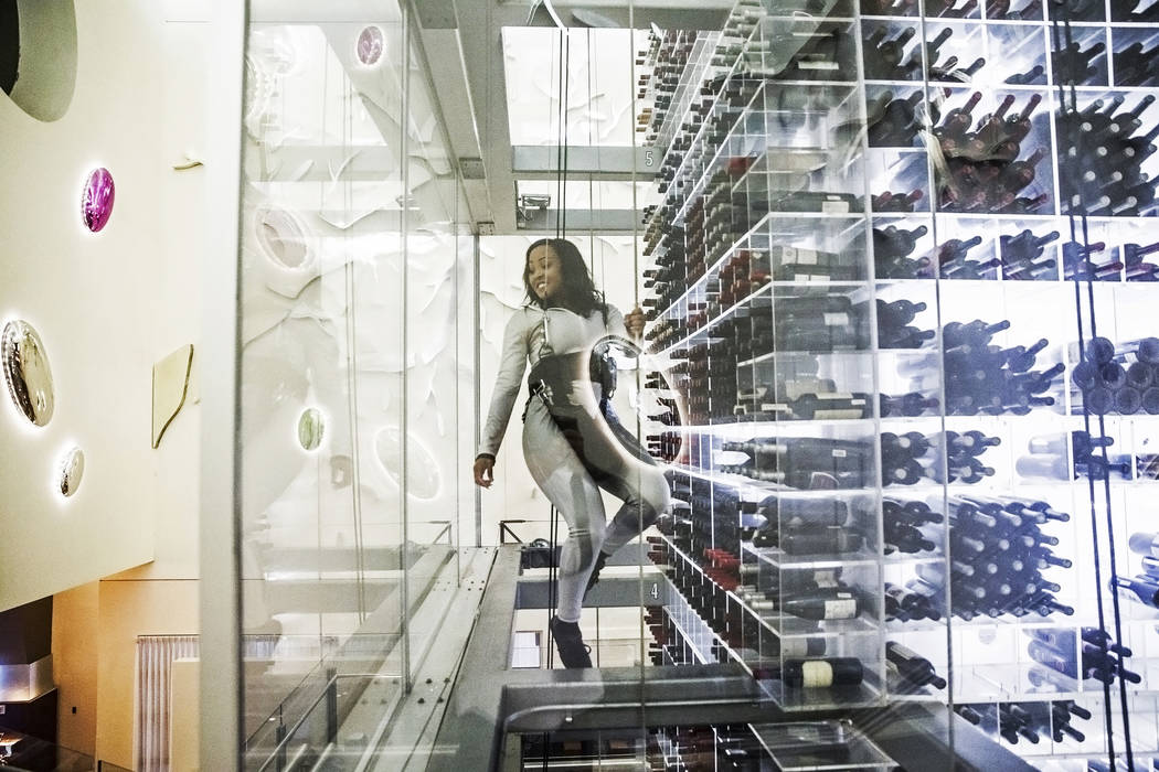 Perhaps it’s her silver jumpsuit, or the six bottles of fine red wine holstered on each hip. Or maybe it’s the way she gracefully points the toes of one foot while bending the other knee, as a mechanized set of pulleys and cables hoists her to a storage bin four stories above the ground. More likely, it’s all of the above, and then some.