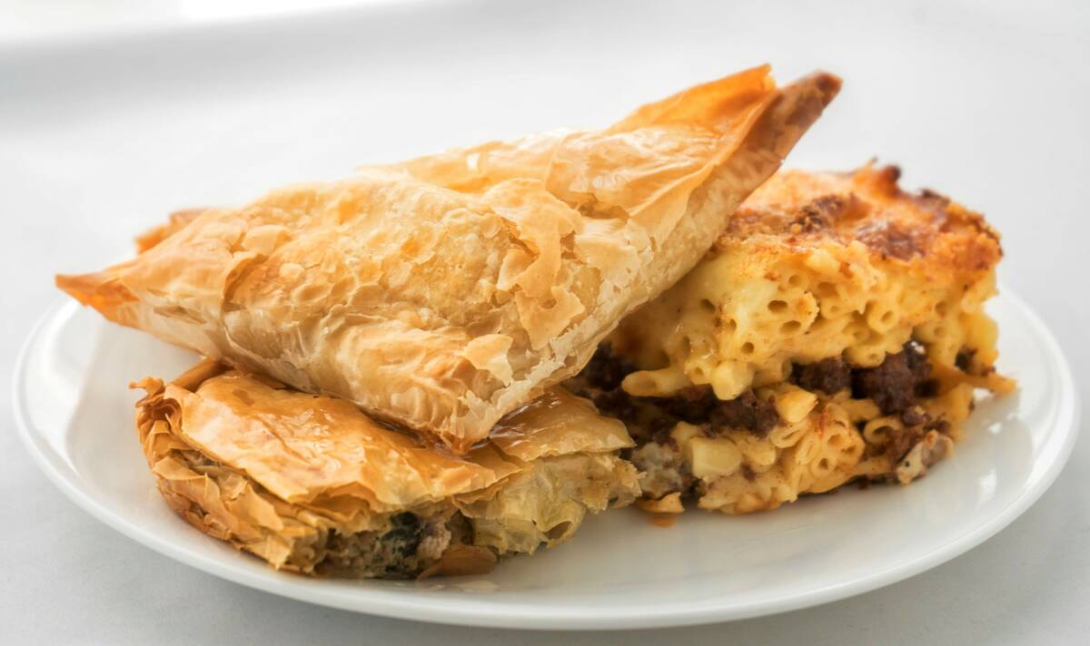What’s on the menu? Pastitsio, dolmades and bogatsa, of course. But also Greek salads and thick-cut Greek fries tossed with garlic, oregano and lemon; tiropita and spanakopita with layers of buttered phyllo; breaded and fried saganaki cheese flambéed in brandy; gyros stuffed with meat cooked on vertical spits; lamb chops, chicken, loukaniko sausage and souvlaki skewers pulled straight from the grill, then served with salad, pilaf and pita.