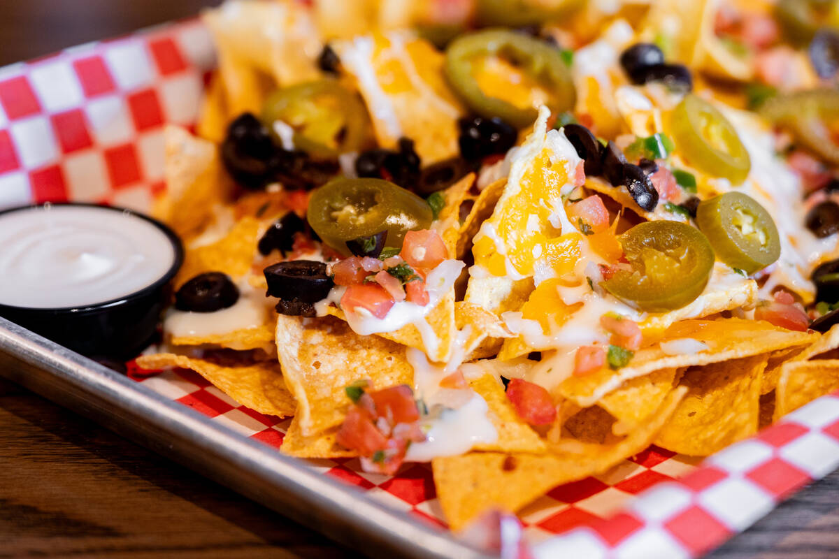 Ballpark nachos lead off the menu, built from tortilla chips, melted cheese, poblano queso blanco, pico de gallo, jalapeños, black olives, sour cream and house salsa (plus chili, chicken or steak add-ons). Joining the nachos: wings with sauces such as buffalo, garlic Parmesan, sriracha honey barbecue and buffalo pastor.