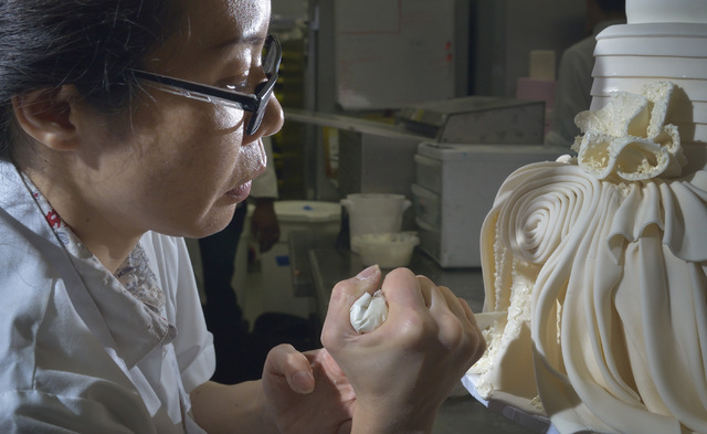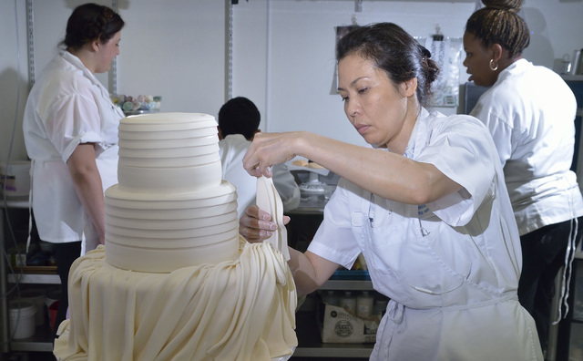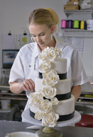 Although baking is done for the day, the bakery kitchen is alive with activity. Employees are transforming cakes into edible works of art with their decorations.