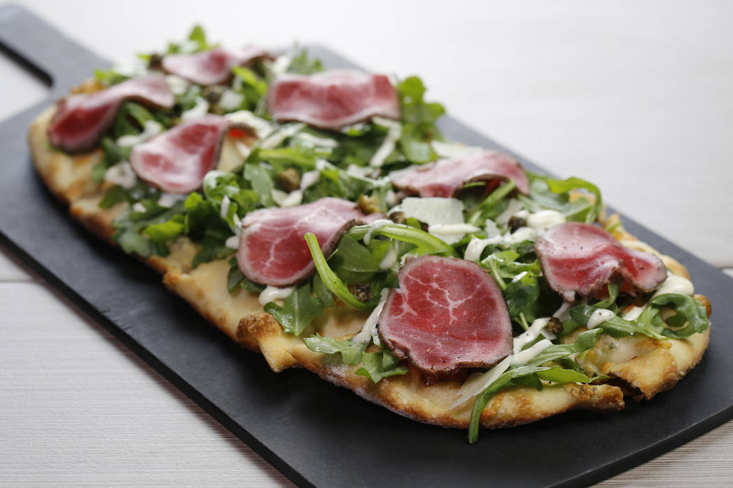 Flatbreads are believed to date back thousands of years and are found in nearly every region of the world. But this mashup is strictly 21st century: For beef carpaccio flatbread, the crust is topped with beef tenderloin, roasted tomatoes, extra-virgin olive oil, arugula, blue cheese, lemon aioli, shaved Parmesan and capers.