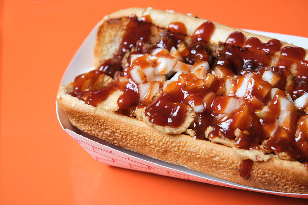 — The Chili Cheese wiener is topped with homemade vegan chili and cashew-based nacho cheese sauce.