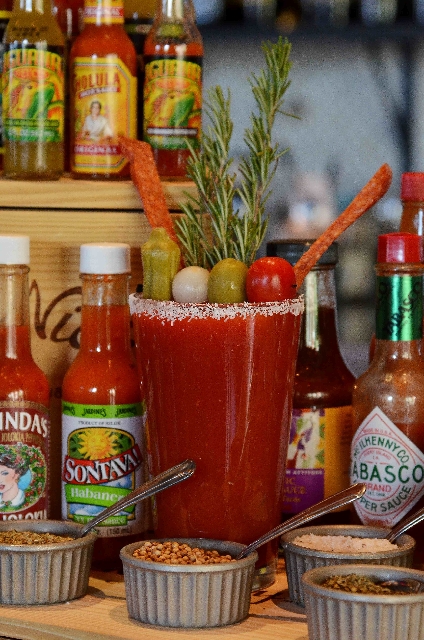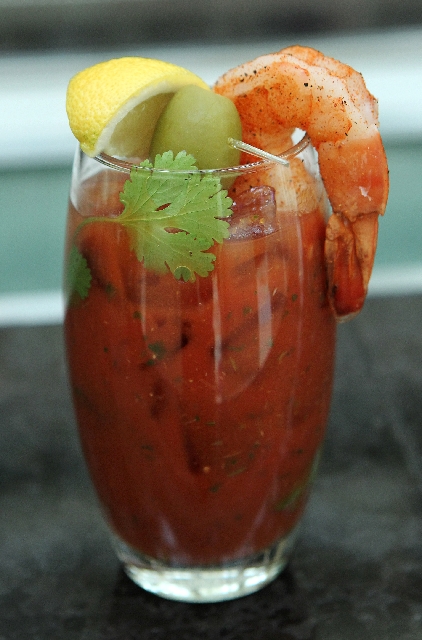 Fill a large wineglass with ice. Add tomato juice, then remainder of ingredients. Stir and garnish.