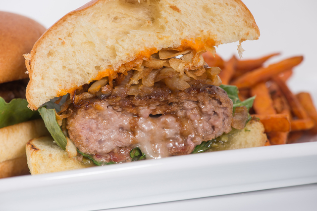 The Mirage, all month: Juicy Goosey, ground duck stuffed with Muenster cheese, watercress, tomatoes and bacon-onion jam, $30 at Portofino; Heritage Burger, 10 ounces topped with foie gras and cheddar, $38 at Heritage Steak; 10-ounce Kobe burger, $34 at Stack; I-80, with cheddar, caramelized onions, peppercorn-crusted bacon and barbecue sauce, $15 at BLT Burger; Volcano Burger, with smoked linguica, fried egg, jalapenos and sriracha mayo, $18 at Paradise cafe; pork sliders with Japanese barbecue sauce and Asian slaw, $4 each at Japonais; and turducken sliders between miniature waffles, $19.50 at Carnegie Deli.