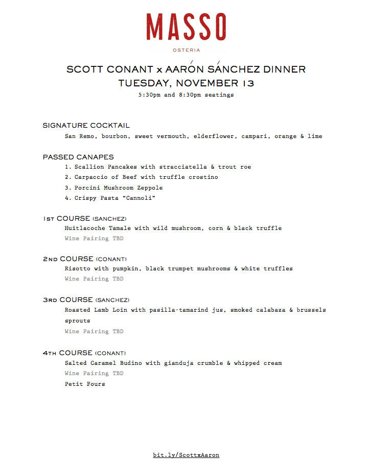 Scott Conant is inviting Aaron Sanchez into the kitchen of his Red Rock Resort restaurant, Masso Osteria, on Tuesday to collaborate on a four-course dinner.