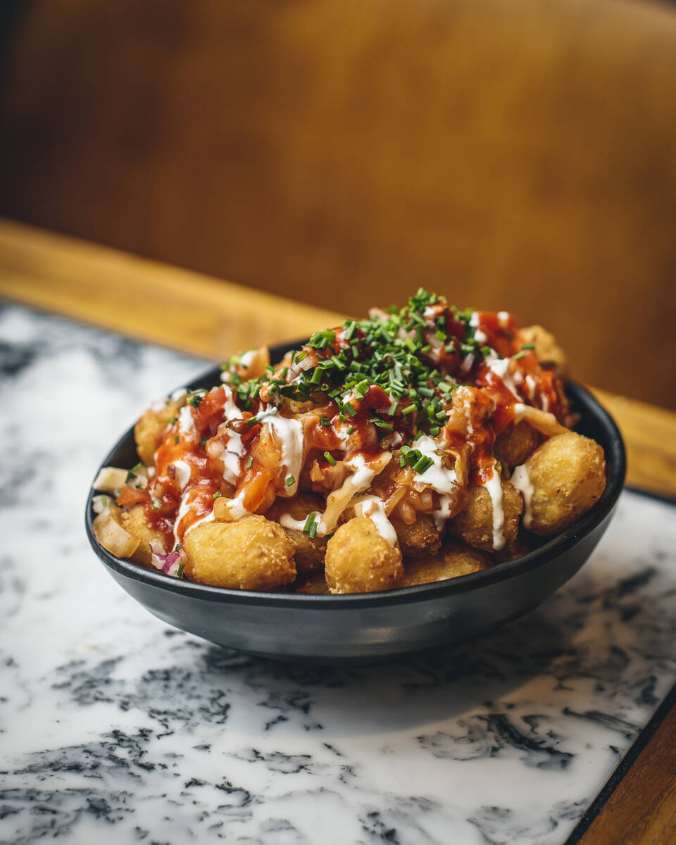 At Proper Eats, Seoul Bird dishes include K-Tots topped with melted cheese, kimchi and hot sauce, and a signature fried chicken sandwich with signature sauce and Kewpie mayonnaise.