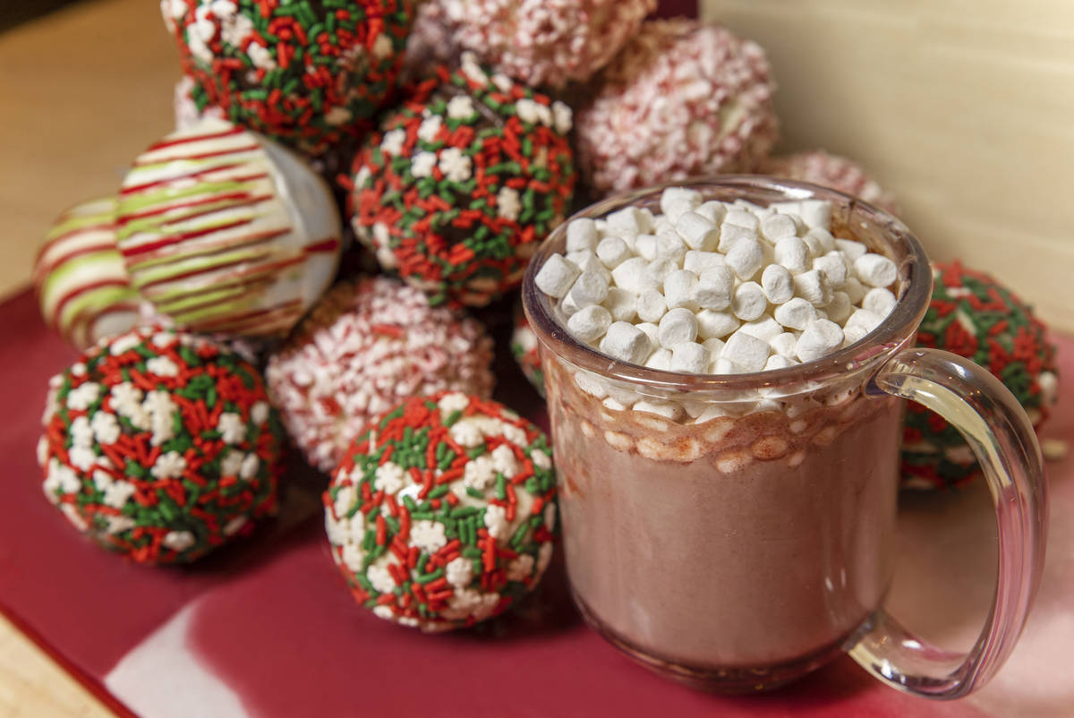 One, for example, has peppermint-tinged cocoa mix and is coated with crushed peppermint candy. The Drunken Cocoa Bomb served at Merry Crimson finishes a traditional cocoa-marshmallow combination with Captain Morgan Gingerbread Rum.