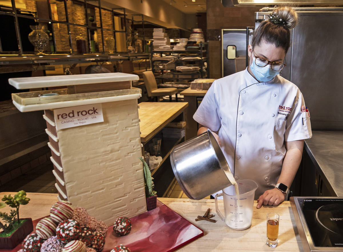 Pastry chef Brittany Simmons prepares to make a hot cocoa bomb cocktail on Monday, Nov. 23, 2020, at Red Rock Resort in Las Vegas. (Benjamin Hager/Las Vegas Review-Journal) @benjaminhphoto