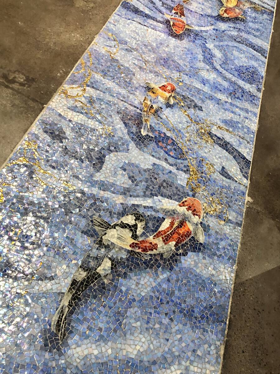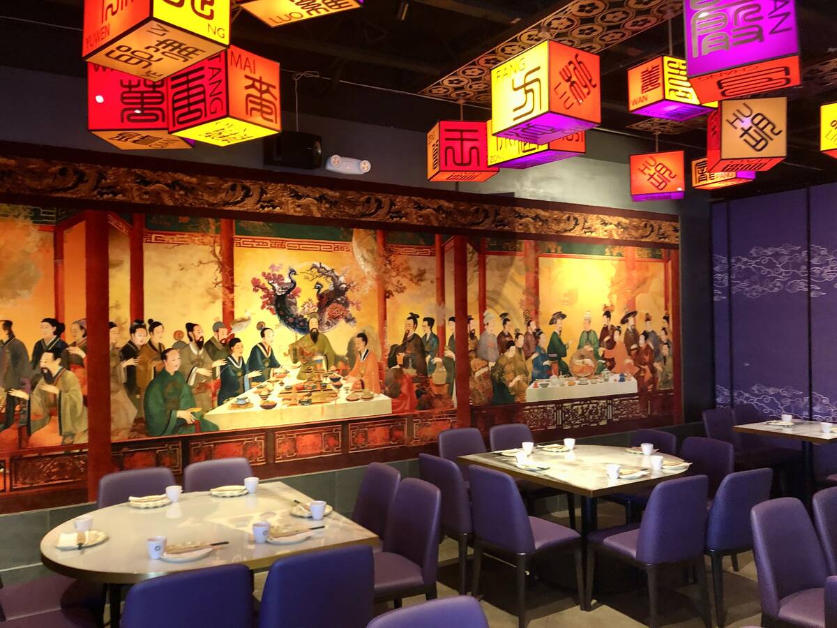 Colorful lanterns bearing simplified Chinese characters populate the dining room of Palette Tea Lounge. A mural of a Chinese courtly scene proceeds along one wall. Along another wall, a mural shows a sweep of misty coast rendered in black-and-white ink. Mosaics of swimming koi, set into the floor, flow past the kitchen.