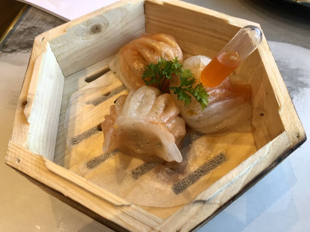 Har gow, a dim sum essential, arrive just after, but these har gow have been upgraded: Lobster fills their skins, and an ampule of lobster butter stock — for injecting into the dumplings — comes along in the steamer.