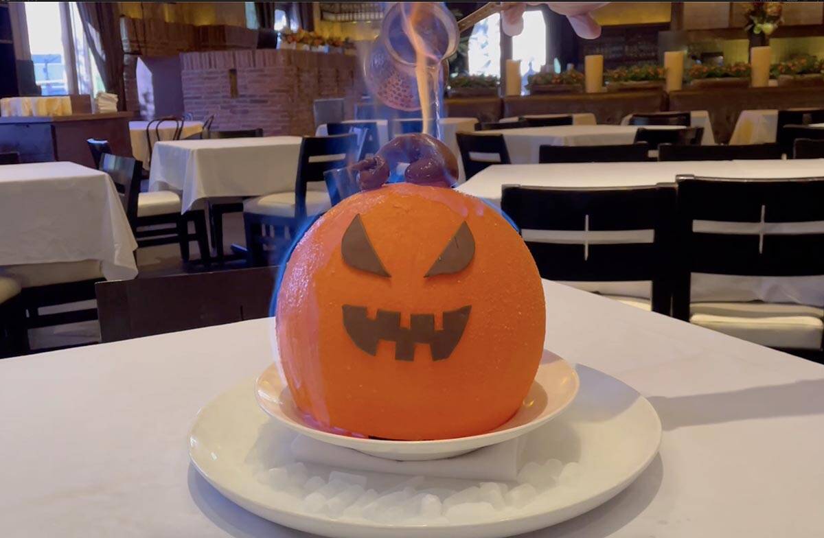 The Spooky Tartufo Fantasia is a shimmering jack-o’-lantern that is set on fire to reveal a stack of gelatos, chocolate cake, chantilly and fresh strawberries inside.
