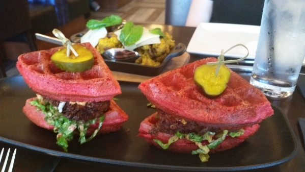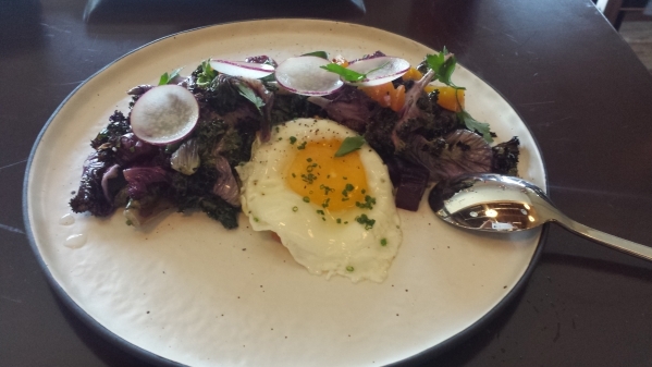 The menu items we selected were charred kale with bacon, two types of beets and an over-easy egg on top; roasted curry cauliflower with almonds and dates; and a type of bruschetta consisting of eggplant, tomato and cheese.