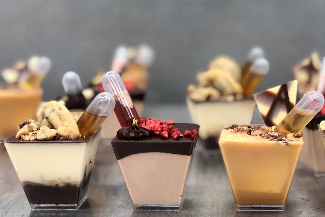 Each of Freed’s mini-cups, which are available in four flavors, is infused with liquor and comes with a liquor-filled pipette. There’s milk and cookies, which is ganache, chocolate chip cookies and Disaronno panna cotta; mudslide, with ganache, chocolate crunch and Kahlua and Bailey’s panna cottas; bourbon caramel, with salted caramel and bourbon-caramel panna cotta; and Choc-Chambord, with Chambord chocolate mousse and ganache.