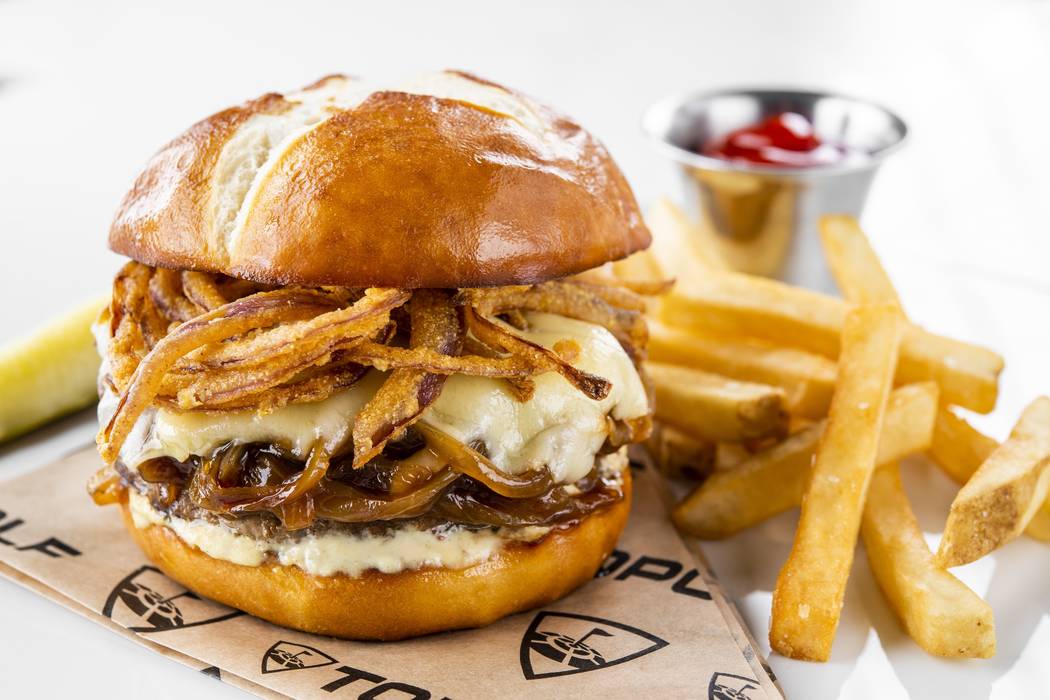 It’s a juicy, 7-ounce burger perched on a pretzel bun and topped with both caramelized and crispy onions, Gruyere cheese and horseradish Dijon.