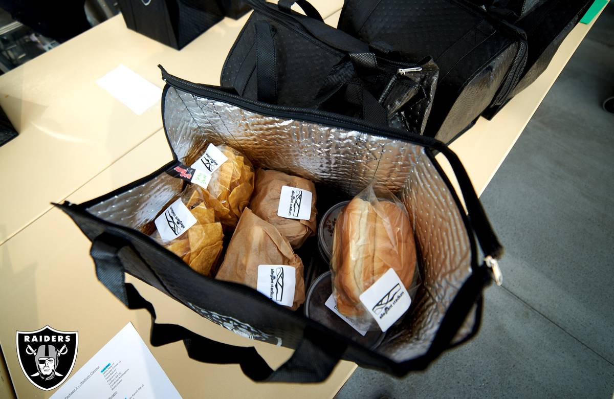 The most basic package is Stadium Classics, which comes with four Raiders Dogs, one meatless loaded nachos, one Raiders Deluxe Popcorn, four water bottles, two bottled soft drinks and a “Signature Swag” package, $50.
