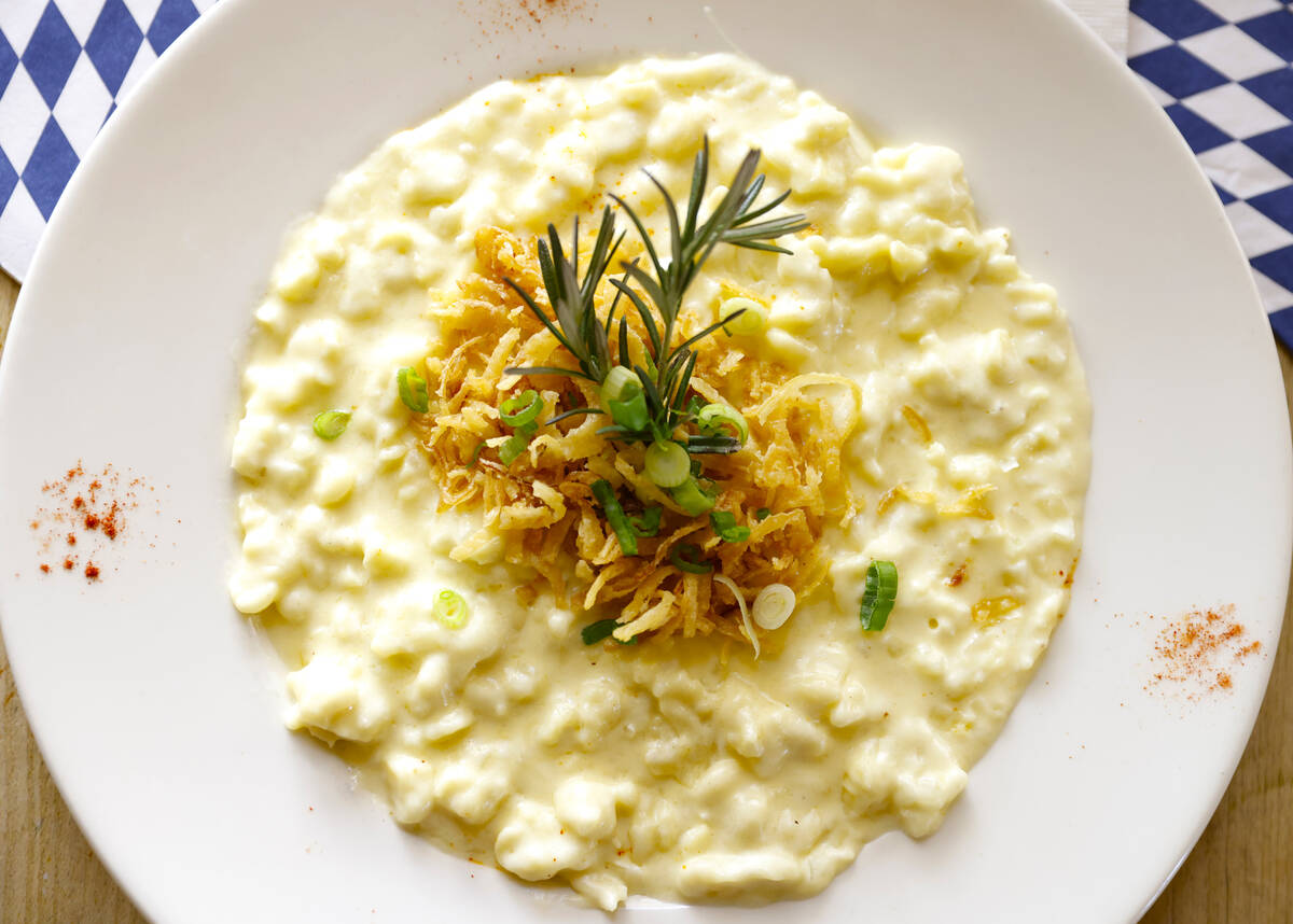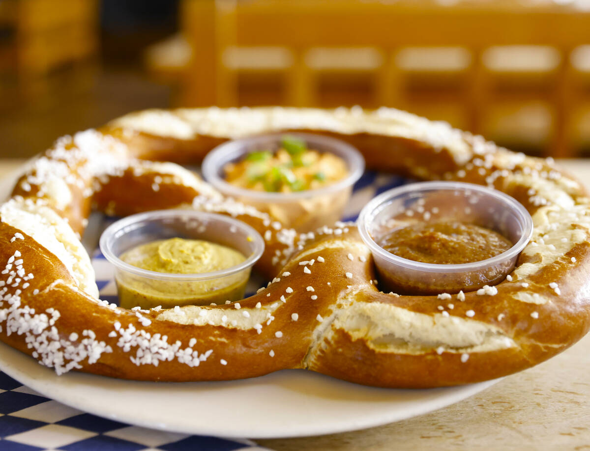 A Riesenbrezen combo features a soft oversize pretzel, Obatzda beer cheese spread and Bavarian sweet mustard. A sausage tower is stocked with Bavarian sausages (custom made for the restaurant), sauerkraut, mashed potatoes and house potato salad. A Bavarian platter brings together pork three ways — loin, roast, sausage — with dark beer sauce, sauerkraut and mashed potatoes.