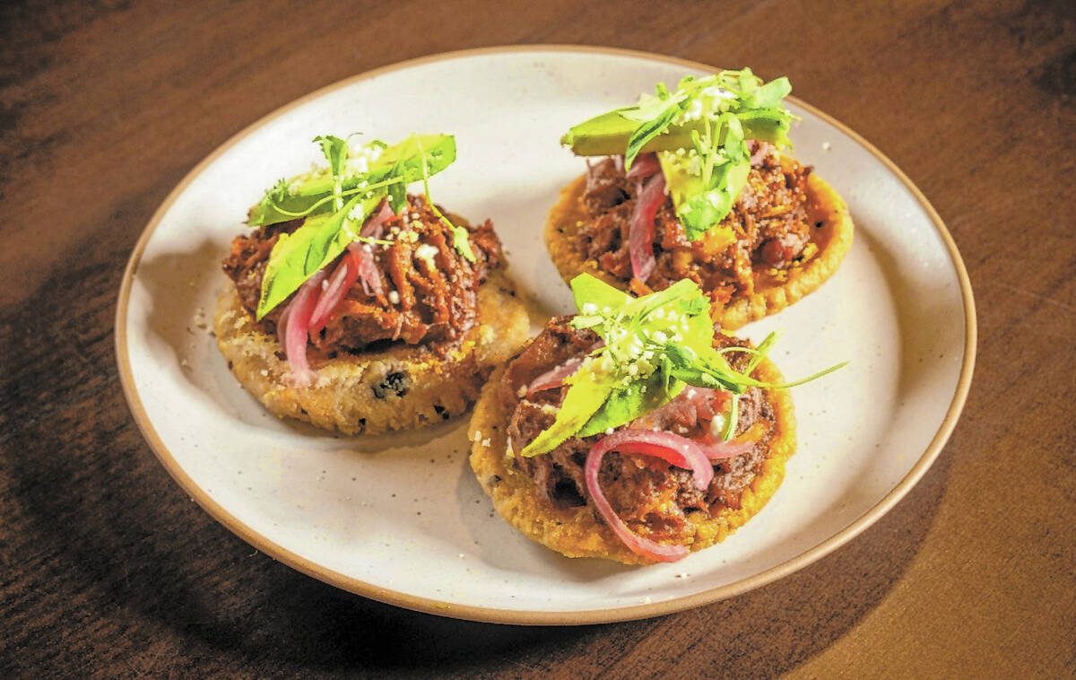 Entrée choices consist of tacos with pastor-style fish, arroz verde rice with pipián mole, torta ahogada pork confit sandwich with salsa roja, and chilaquiles built with totopos corn chips, pasilla chile salsa and queso fresco, plus optional add-ons such as a fried egg, roasted chicken or carne asada. Dessert features a trio: panqué de elote sweet corn cake, meringues and mini buñuelos.