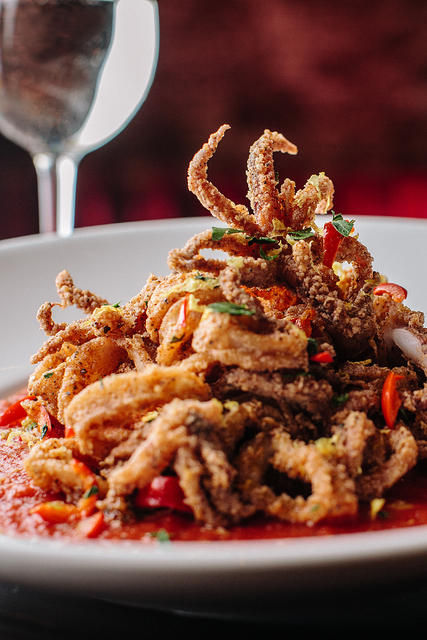 This seafoody take on wings is fried and tossed in a choice of sauces (barbecue, mild, medium, hot, Cajun, atomic, jerk or garlic-Parmesan) and served with celery and carrots and blue cheese and ranch dressings, $12.