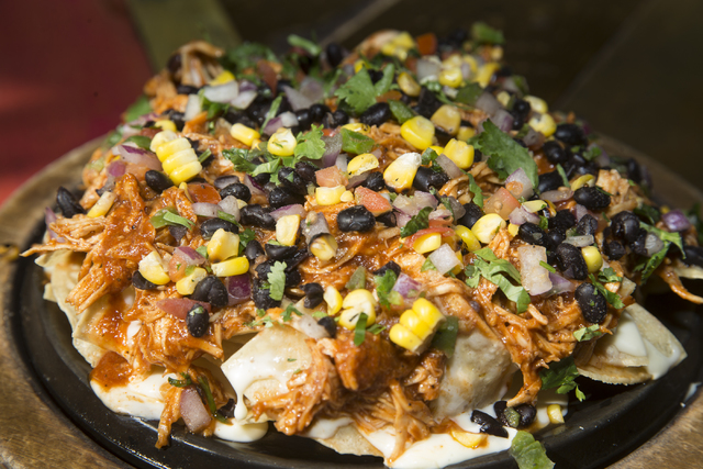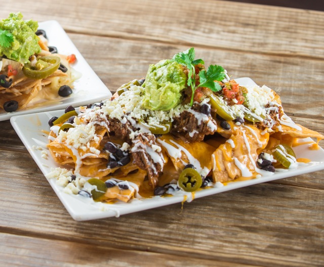 A classic Mexican tailgate treat gets an American twist, the tortilla chips topped with beef barbacoa, black olives, house-made beer-cheddar, pickled jalapeños, avocado, salsa and crema, $13.95.