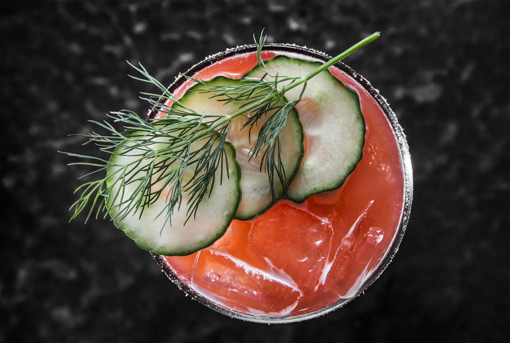 Mix liquids together. Stir in horseradish. Shake with ice. Strain into salt-rimmed glass. Garnish with cucumber and dill.
