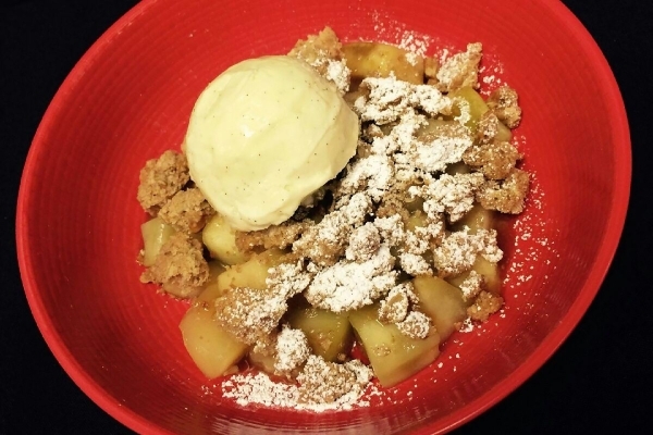 This old-fashioned dessert is made with oat crumble and served with vanilla ice cream, $8.