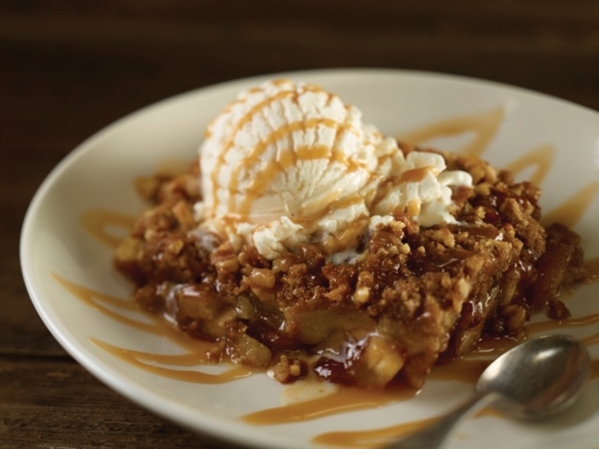 Thickly cut apples are mixed with spices, baked until golden brown and served warm with vanilla ice cream, walnuts and caramel sauce, $8.95.